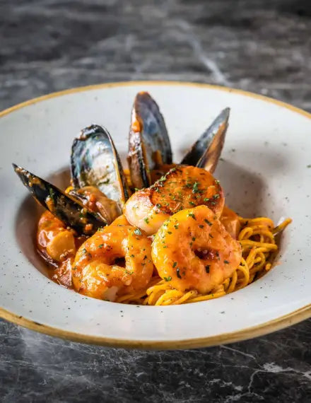 Seafood Pasta with Clams, mussels, calamari, shrimps, and cherry tomatoes in marinara sauce
